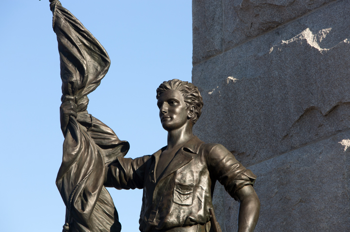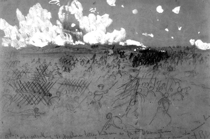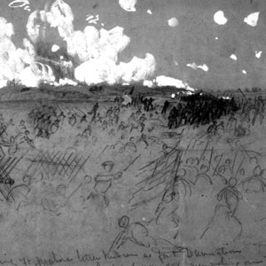 En route to meet General Grant at the Wallace House in Petersburg, President Lincoln and his group stopped at Fort Mahone, often called Fort Damnation. Here Lincoln climbed a fortification where the Union IX Corps assault had taken place the day before. Many bloated bodies, both Union and Confederate, still lay sprawled about the battleground. Among them were members of Union General Charles H.T. Collis' colorful 114th Pennsylvania Regiment, whom Lincoln had seen on guard duty at City Point earlier in the week. A cavalryman in the escort saw tears streaming down Lincoln's cheeks while there. Lincoln's bodyguard, William Crook, made note that Lincoln's face had "settled into its old lines of sadness" over the cost of human life and suffering during the long war. A monument, erected by the State of Pennsylvania in honor of the soldiers of the 3rd Division, 9th Corps, Army of the Potomac, stands at the Fort Mahone site.